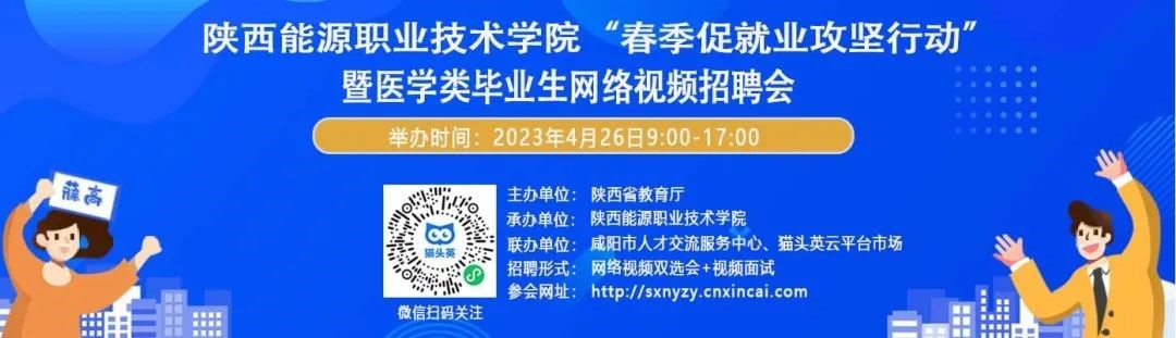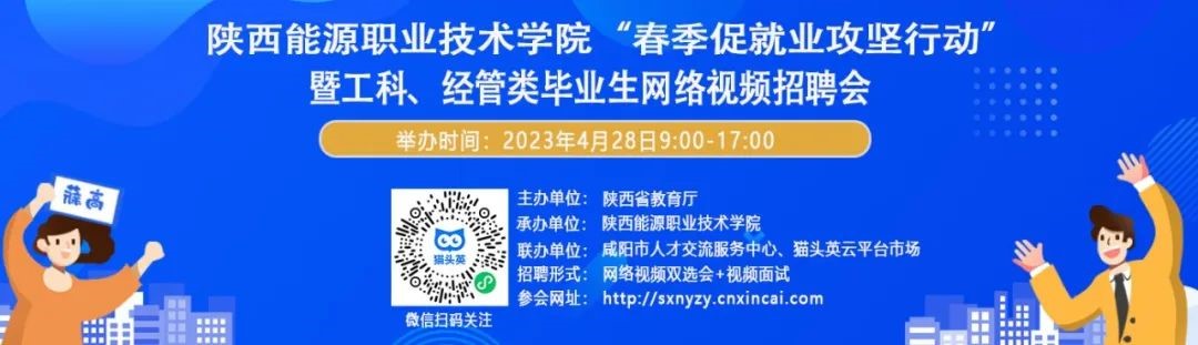 为深入学习贯彻党的二十大精神,落实党中央、国务院“稳就业”“保就业”决策部署,根据《教育部办公厅关于开展2023届高校毕业生春季促就业攻坚行动的通知》、《陕西省教育厅办公室关于做好现阶段高校毕业生就业有关工作的通知》及《陕西能源职业技术学院关于开展2023届毕业生毕业季促就业攻坚行动的通知》精神,学校抢抓春季促就业关键期,继开学俩场线下大型校园招聘会暨企业家、院长进校园活动开展后,为持续为毕业生与就业合作单位搭建求职招聘平台,拓宽就业渠道,学校分别于4月26日、4月28日通过猫头英云人才市场开展“陕西能源职业技术学院‘春季促就业攻坚行动’暨工科、经管类毕业生网络视频招聘会”暨线上访企拓岗行动、“陕西能源职业技术学院‘春季促就业攻坚行动’暨医学类毕业生网络视频招聘会”暨线上访企拓岗行动。共提供建筑、采矿、制造、商贸、医院等各类企事业单位上百家,就业岗位千余个。