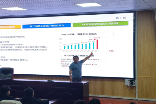 此外,于涛还为毕业生提供了实用的求职建议。他强调毕业生应始终保持积极向上的态度,合理调整就业心理预期,积极参与市场竞争;明确职业目标和生涯发展方向。课程结束时,于涛鼓励毕业生勇敢面对就业挑战,把握机遇,实现个人职业梦想。