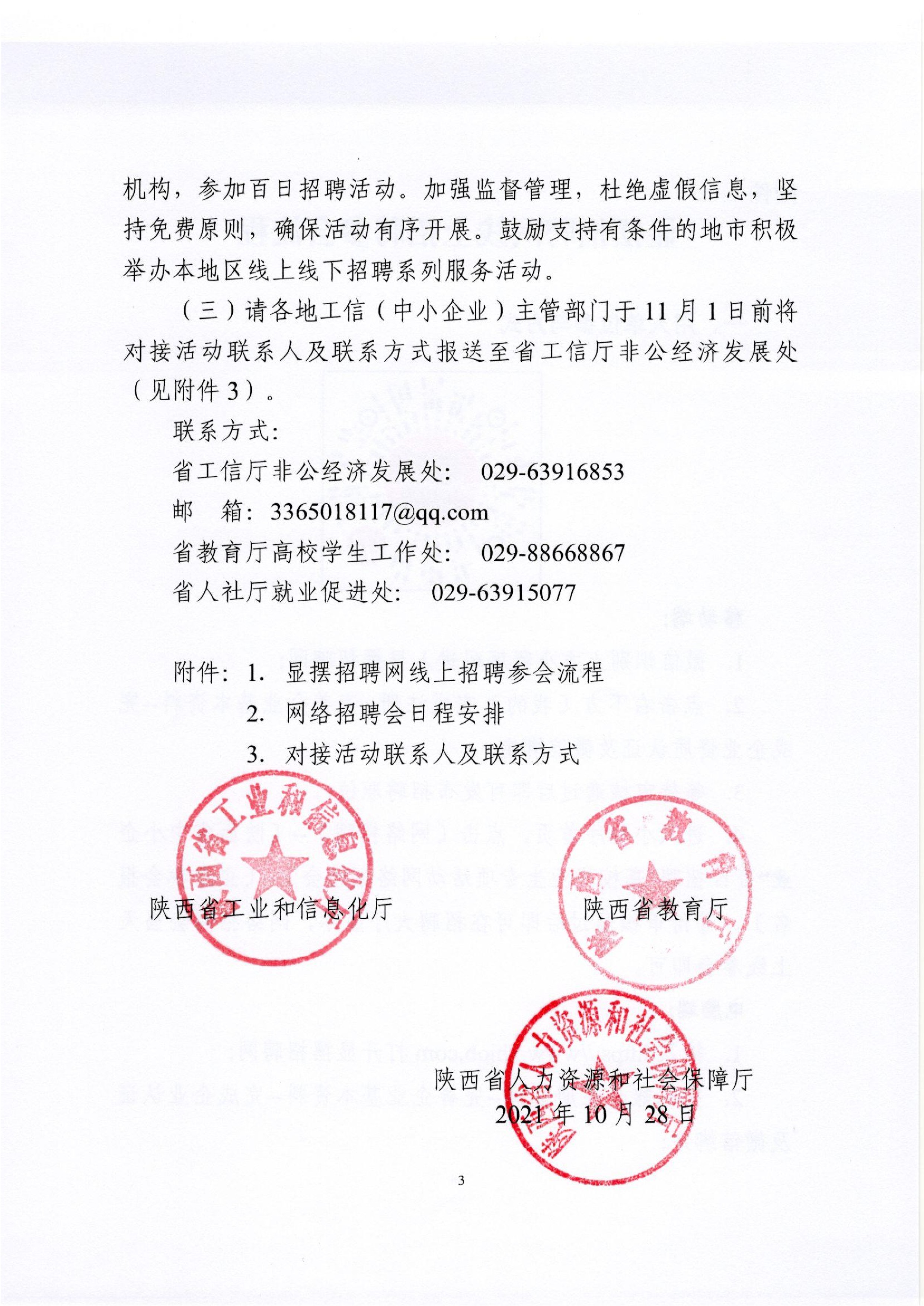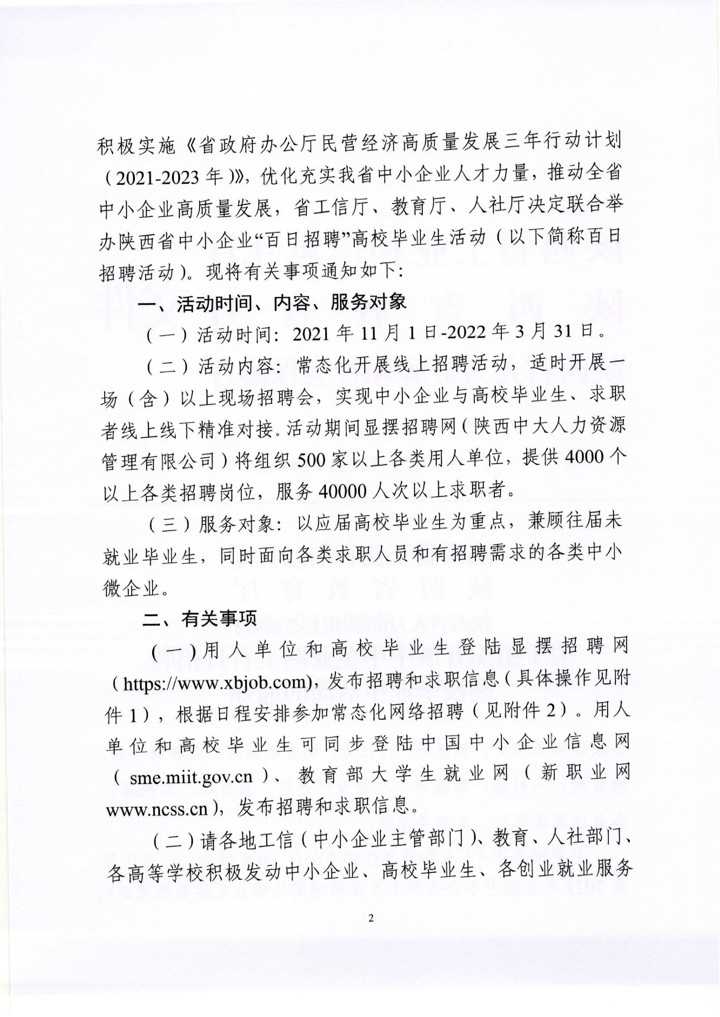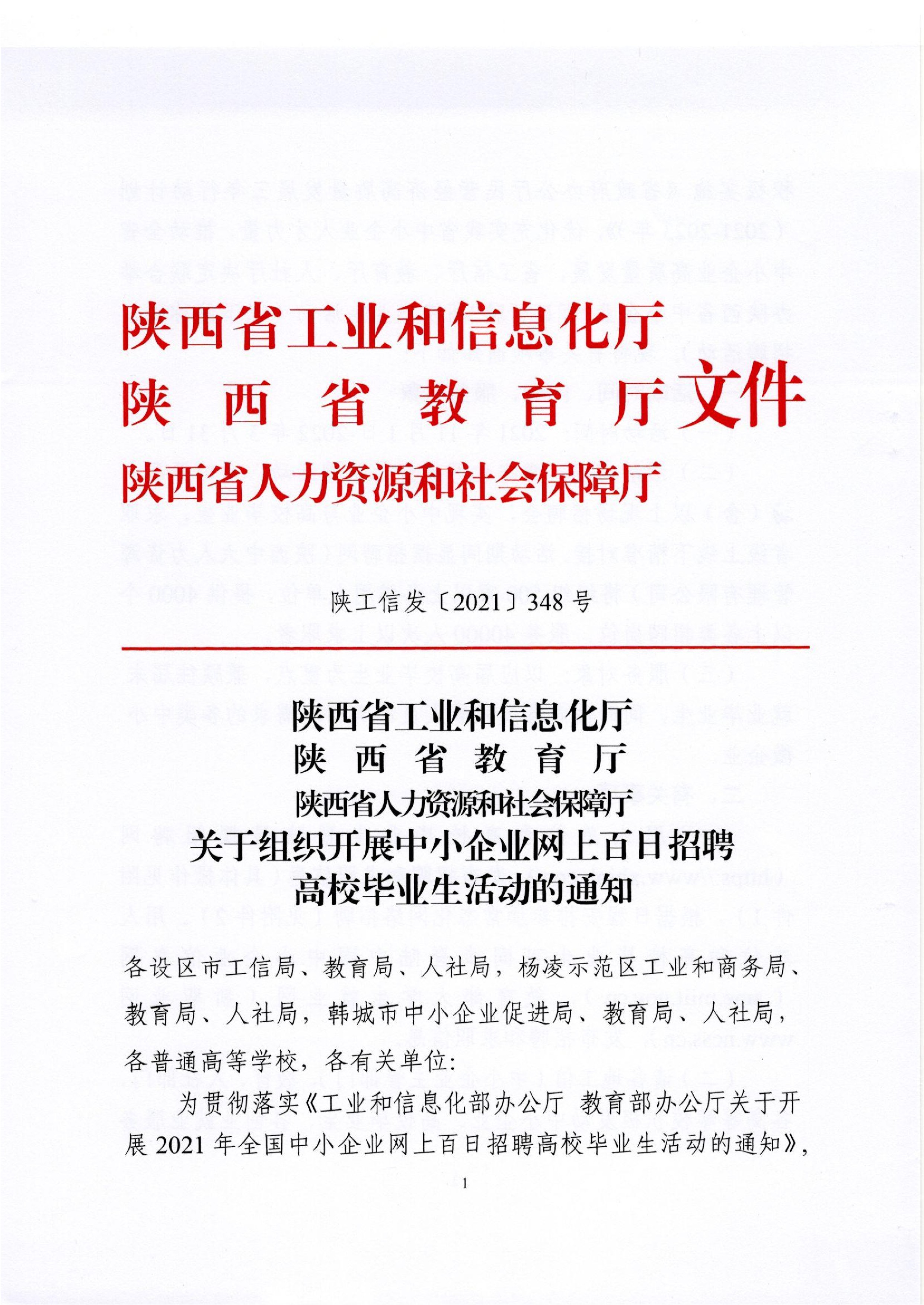 陕西省工业和信息化厅 陕西省教育厅 陕西省人力资源和社会保障厅 关于组织开展中小企业百日招聘高校毕业生活动的通知