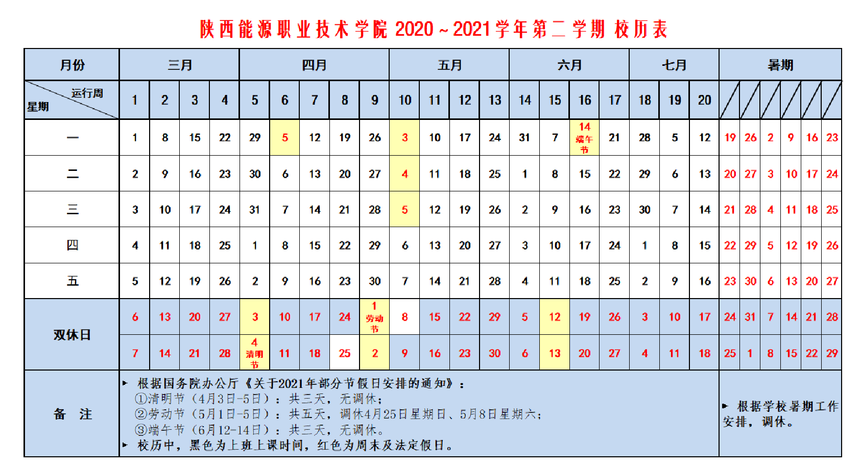 2020-2021第二学期 校历表(2021上半年)