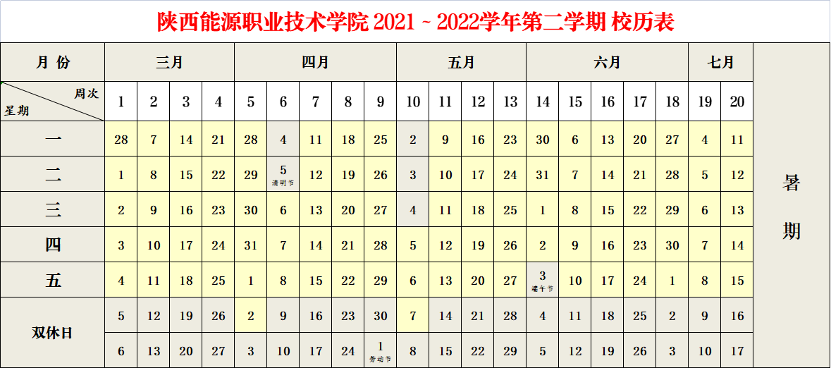 2021-2022学年 第二学期 校历表