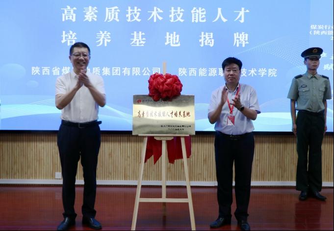 学校党委书记刘予东(左)与陕西煤田地质有限公司党委书记谢辉(右)为高素质技术技能人才培养基地揭牌