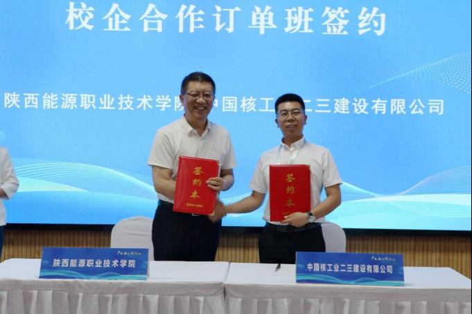 学校党委书记刘予东(左)、中国核工业二三建设有限公司人力资源部经理强彩鹏(右)签署订单班协议