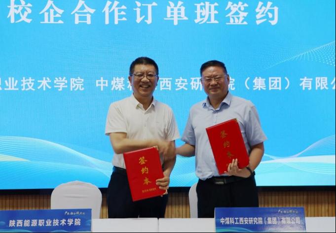 学校党委书记刘予东(左)、中煤科工西安研究院(集团)有限公司副总经理张壮路(右)签署订单班协议