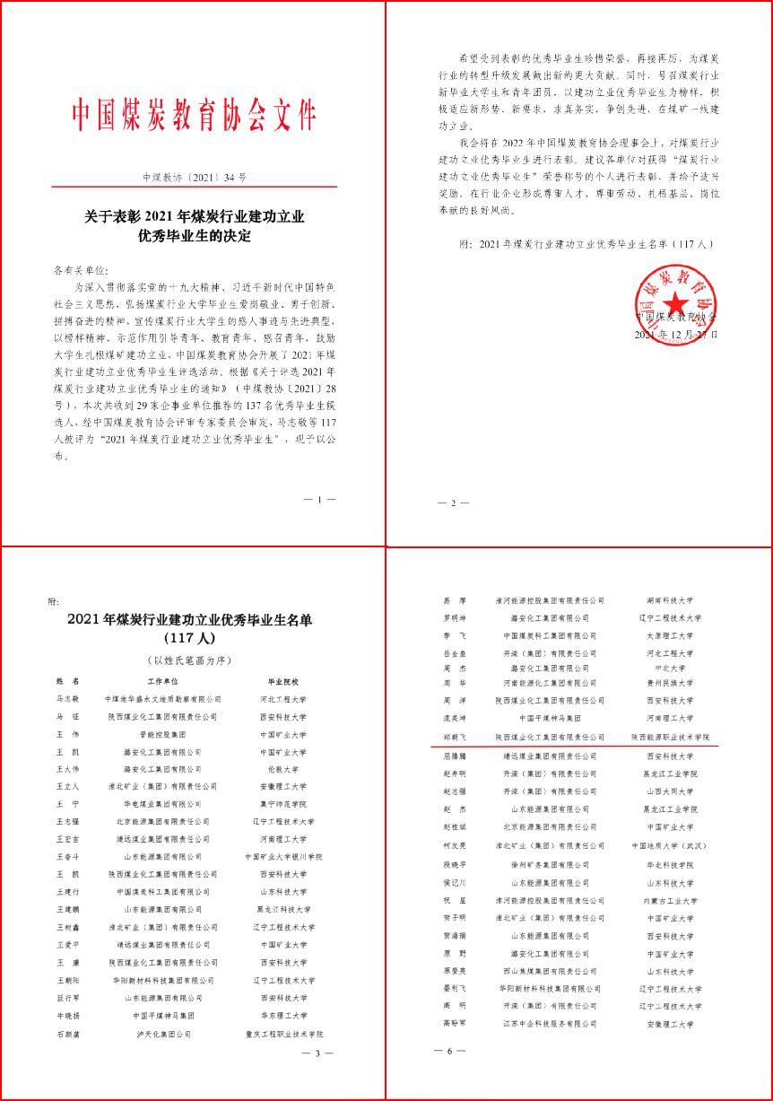 近日,中国煤炭教育协会下发了《关于表彰2021年煤炭行业建功立业优秀毕业生的决定》(中煤教协[2021]34号)文件,经中国煤炭教育协会评审专家委员会审定,117人被评为“2021年煤炭行业建功立业优秀毕业生”。我校校友郑朝飞,入列表彰名单。
