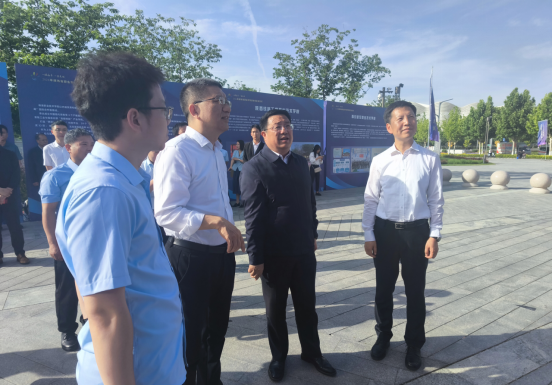 省政协副主席、省中华职业教育社主任李忠民(右二)、省委教育工委委员、省教育厅副厅长申雪峰(右一)与我校党委书记刘予东(左二)在我校展板前交流、观看技能展示
