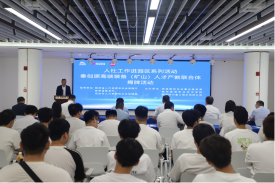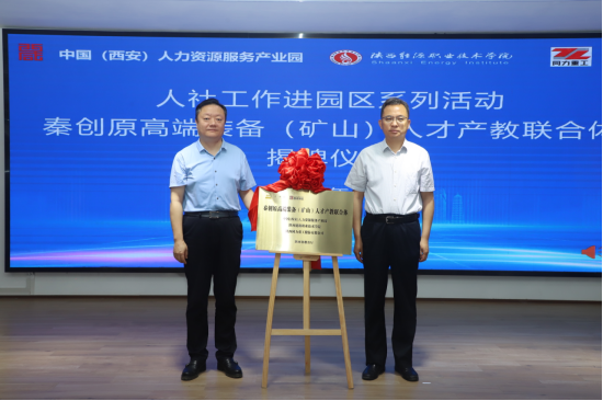 西安市人力资源和社会保障局人力资源市场处处长郭焱、西咸新区党工委委员、管委会副主任张渭为秦创原高端装备(矿山)人才产教联合体进行揭牌。