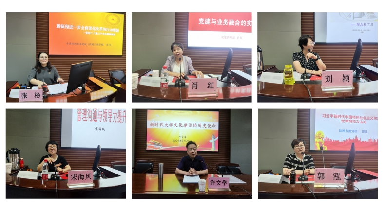 培训期间,采取辅导报告、观看视频和交流研讨等相结合的方式进行,聚焦双高建设、领导干部作风素质能力、依法治校和改革发展中的重点、难点问题。中共陕西省委党校(陕西行政学院)生态文明教研部主任、教授张杨作题为《进一步全面深化改革,为中国式现代化提供强大动力和制度保障——党的二十届三中全会精神学习解读》报告,就“二十届三中全会的重大时代意义和深远历史影响”“全面准确理解进一步全面深化改革的重大举措”“提高党对进一步全面深化改革的领导水平”三部分对二十届三中全会精神进行了全面、精准的解读;中共陕西省委党校(陕西行政学院)党的建设教研部教授肖红作题为《党建与业务工作深度融合的路径选择》报告,从党章引入,以做好高校党建工作应该熟知的八个主要党内法规及工作要求为切入点,采用大量的历史事件、视频资料和具体创新案例,分别从“党建的基本理论及科学内涵”、“高等学校基层党建工作重点”“党建与业务融合的实践路径”三方面就党建与业务工作深度融合的路径选择做了系统的阐释;中共陕西省委党校(陕西行政学院)应急管理培训中心主任、教授刘颖作题为《创新发展和创新思维》报告,通过互动式教学形式,就“什么是创新”“创新思维的类型”“创新思维的三大障碍以及PDCA循环”进行了解读;中共陕西省委党校(陕西行政学院)政治学教研部主任、教授宋海风作题为《管理沟通与领导力提升》报告,引入大量案例,深入浅出地从“沟通的重要性”“沟通之外影响沟通的因素”“影响沟通的两个原则”“沟通的方法与技巧”四个方面进行讲授;西安海棠学院党委书记、督导专员许文学作题为《新时代大学文化建设的历史使命》报告,从“什么是大学文化”“怎么建设大学文化”“建设怎么样的大学文化”三方面进行了解读;中共陕西省委党校(陕西行政学院)哲学教研部教授郭泓作题为《习近平新时代中国特色社会主义思想的世界观和方法论》报告,回溯历史、结合当下,对进一步学懂弄通做实习近平新时代中国特色社会主义思想,深刻把握好新思想的世界观、方法论和贯穿其中的立场观点方法进行深入解读。