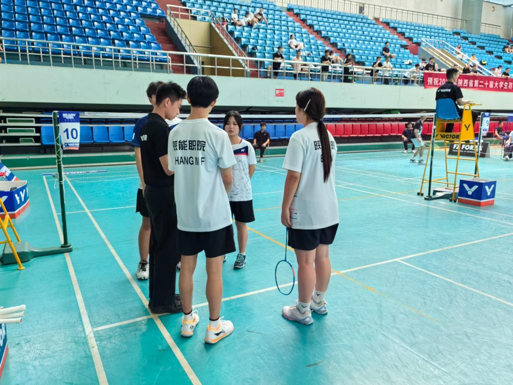 由陕西省教育厅主办的第二十届大学生羽毛球锦标赛,于6月24日至28日在陕西师范大学上林体育馆隆重举行。本次比赛专科院校组别共有24支参赛队伍,我校羽毛球队8名队员参加了男子团体、男单、女单、男双、混双5个项目的比赛。