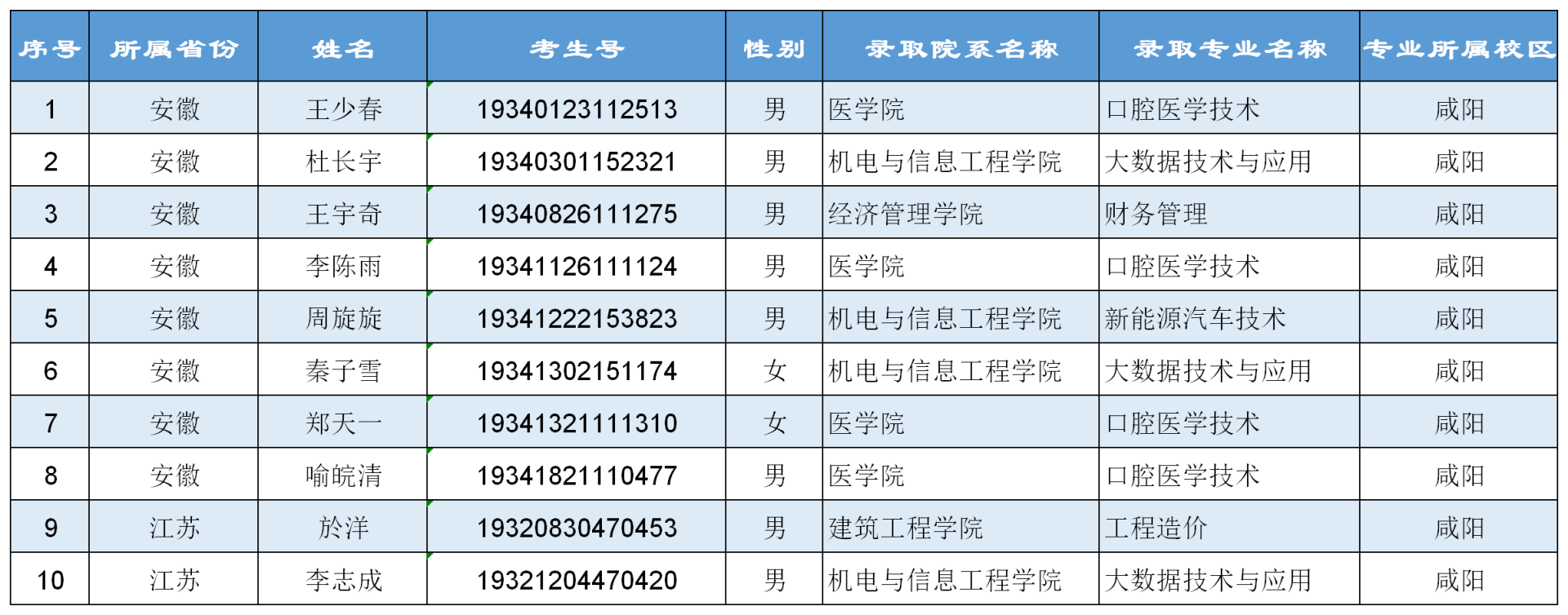 【新生名单】2019年陕能院安徽/江苏录取新生名单