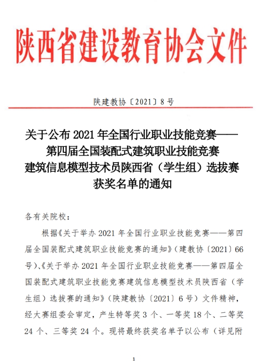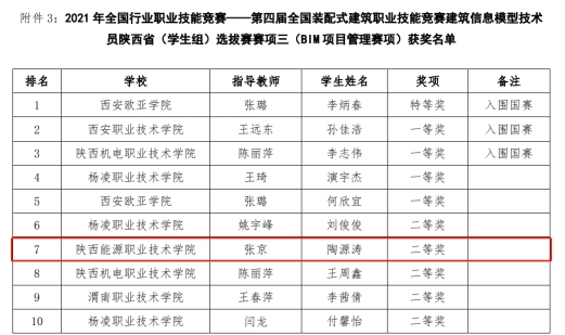 根据《关于公布2021年全国行业职业技能大赛——第四届全国装配式建筑职业技能竞赛建筑信息模型技术员陕西省(学生组)选拔获奖名单的通知》(陕建教协[2021]8号),我校建筑与测绘工程学院张京老师指导的学生陶源涛同学获BIM深化设计赛项一等奖、BIM项目管理赛项二等奖两项;程良老师指导的郑一铭同学获BIM深化设计赛项三等奖一项。