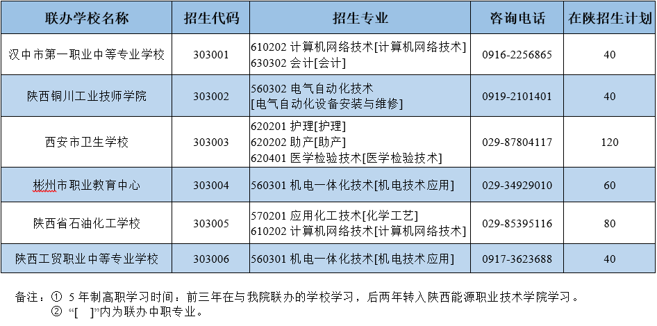 附:具备陕西能源职业技术学院3+2分段高职联办院校一览表