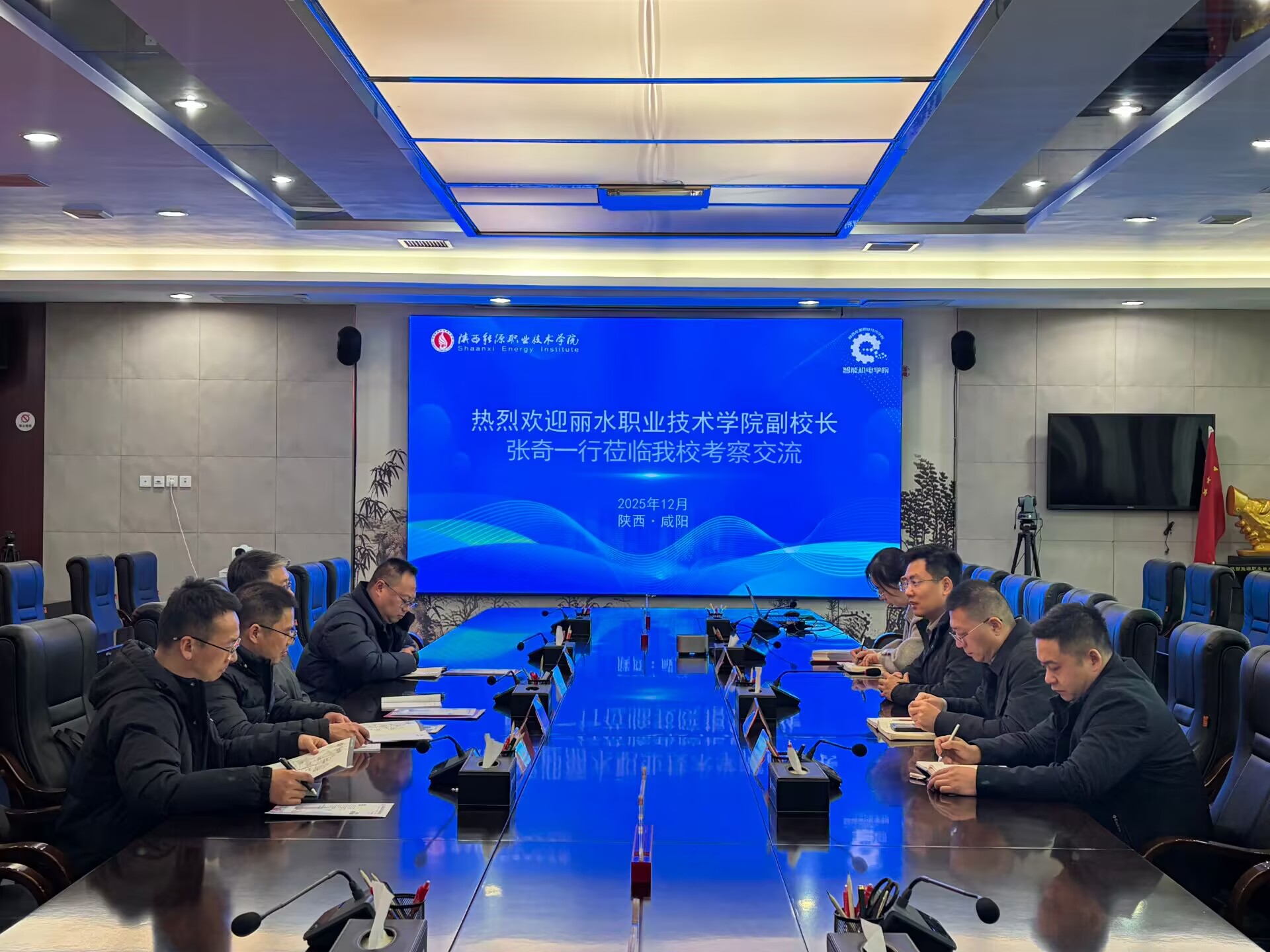 交流座谈会上,罗继军代表学校对张奇一行表示欢迎,简要介绍了我校的基本情况、办学特色及发展历程,强调了学校在服务区域产业发展方面的定位与作用。张奇说明了此次交流的目的,介绍了丽水职业技术学院当前的发展阶段与核心任务,希望能借鉴陕西能源职业技术学院的办学经验,助力自身各项工作推进。