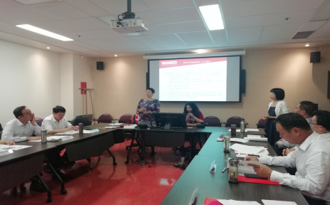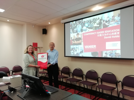 Annie老师首先介绍了自己的个人经历及教学副校长的角色内容、管理权限、工作范畴、法案设计及负责所有专业、负责教和学相关的所有服务,资源工作介绍;同时还分层讲解了二级教学管理、战略招生、多元文化发展、国际合作等介绍分析,并就威尼尔学院的结构组织框架为大家做了详细阐释。尤其是谈到威尼尔培养学生是“助力学生成功,激励参与过程,引导世界公民教育、培育全球观点”的理念让所有团员深深触动,大家就自己本职工作“如何服务好、教育好、引领好、管理好、带动好”学生做了互相交流。课堂气氛热烈,探讨活跃,不时和外籍教师提问、举例、互动、沟通及展示国内做法和我校举措,双方融洽的交流学习,深入交谈。