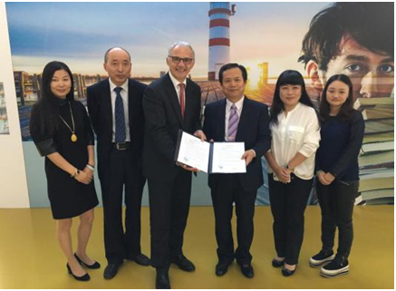 令狐培选书记(右)与布尔根兰应用技术大学院长乔治•佩姆(左)签署合作协议