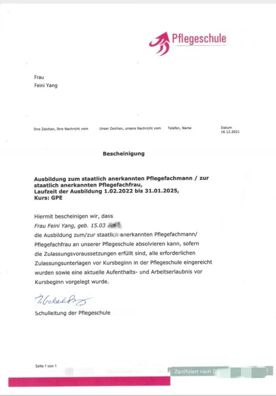 德国双元制护理学院录取通知书