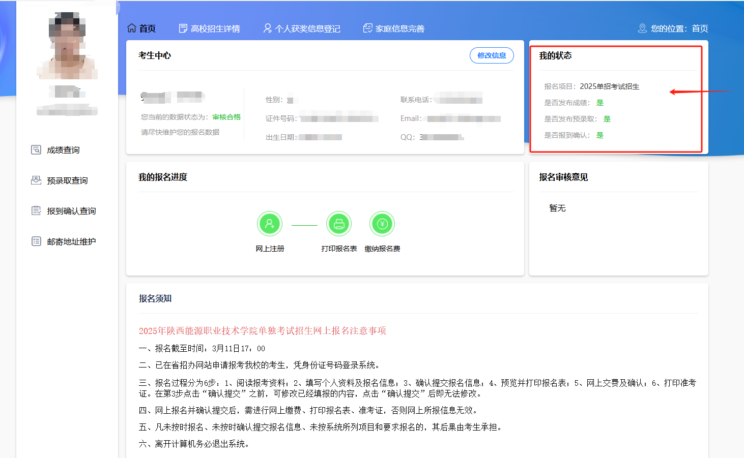 根据陕西省教育考试院2025年分类考试工作通知和学校招生章程,截止2025年3月30日17:00我校报到注册工作已完成。已被预录取但未报到注册的考生,其预录取资格自行取消,仍可参加包括体育单招、消防单招、残障单招、高考统考在内的其他类型考试招生;已经报到注册且已办理正式录取备案手续的考生,不再参加包括以上类型在内的其他各类型考试招生。已经报到注册的考生,学校将办理正式录取备案手续,请在4月2日前登录我校单招报名系统查询报到注册结果。现将注意事项通知如下:一、注册结果查询方式