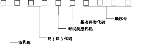 其中市、县(区)代码为报名点所在市、县(区)的代码,考试类型代码为8,报考科类代码为1。